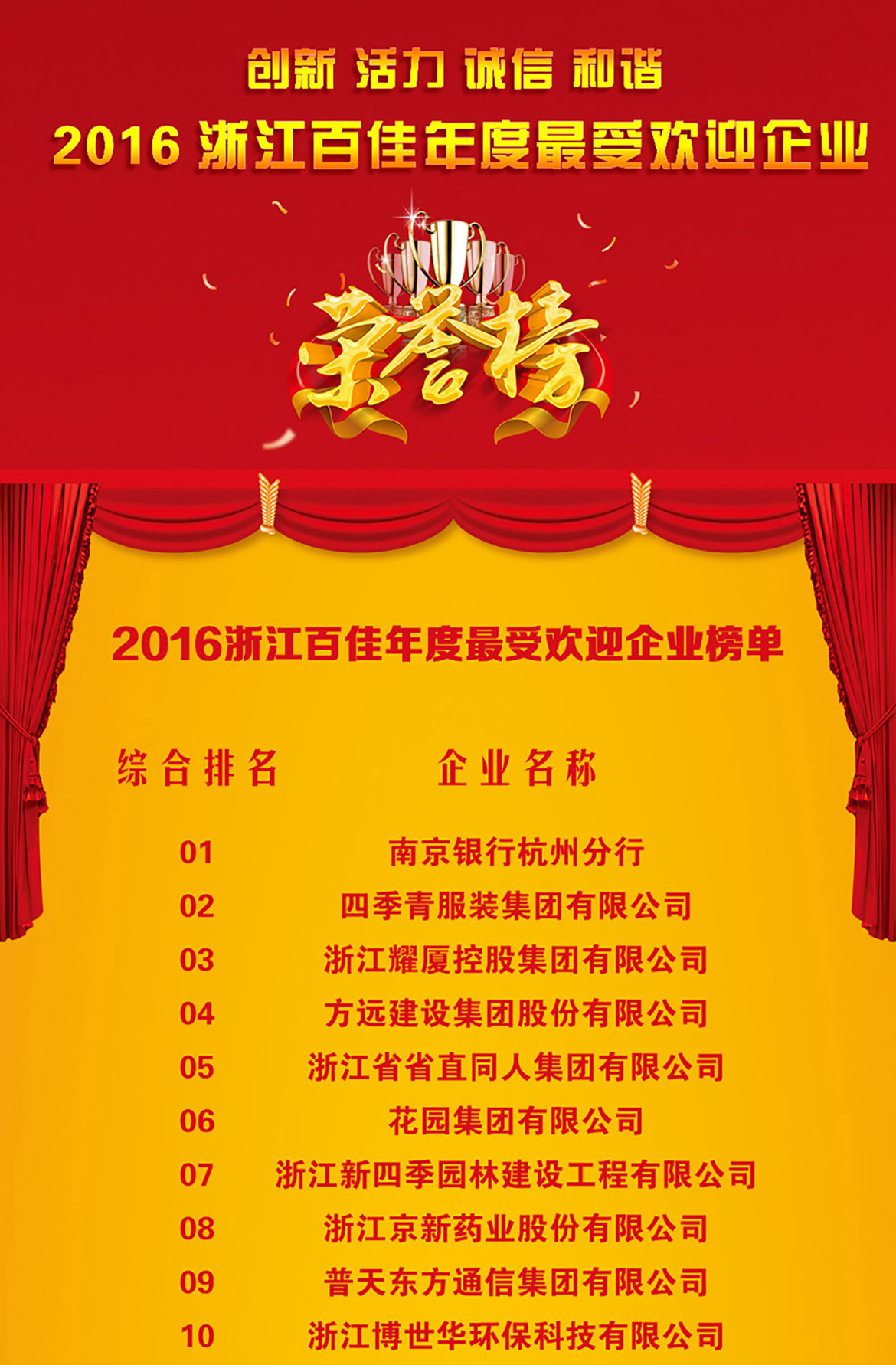 為推動浙江省企業(yè)的誠信和諧經(jīng)營,增添企業(yè)的創(chuàng)新發(fā)展活力和動力,由浙江經(jīng)濟(jì)網(wǎng)、新華網(wǎng)浙江頻道主辦,由中共浙江省委政法委員會、浙江省人大內(nèi)務(wù)司法委員會、浙江省人民檢察院、浙江省科學(xué)技術(shù)廳、浙江省公安廳、浙江省環(huán)境保護(hù)廳、浙江省住房和城鄉(xiāng)建設(shè)廳、浙江省國家稅務(wù)局、浙江省政協(xié)經(jīng)濟(jì)委員會、浙江省總工會、新華網(wǎng)等單位指導(dǎo),于2016年12月聯(lián)合舉辦的“2016浙江百佳年度最受歡迎企業(yè)” 榮譽(yù)榜推選活動日前揭曉,我公司在眾多參評企業(yè)中脫穎而出,取得了第十名的佳績。