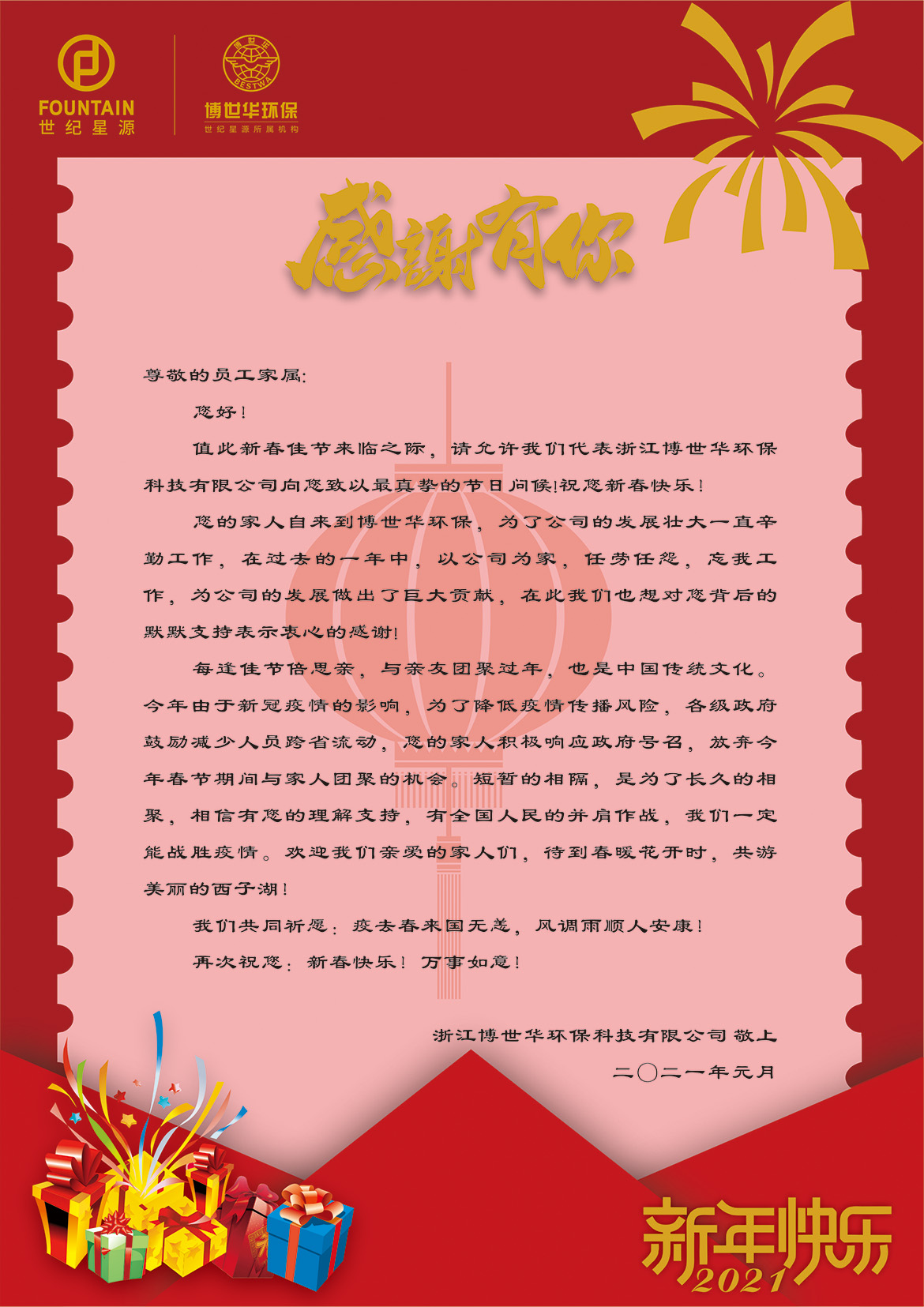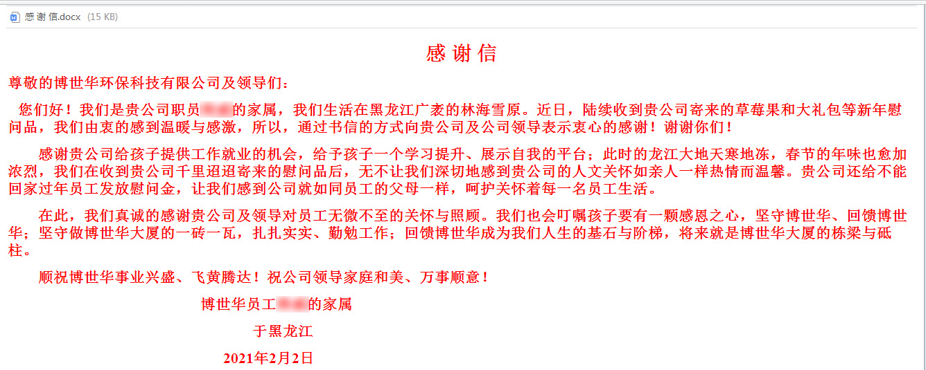 送“祝福”:博世華環(huán)保通過慰問信、微信拜年等方式,向在杭、在項(xiàng)目過年的員工及家屬致以親切慰問,提供更為細(xì)致周到的人文關(guān)懷。