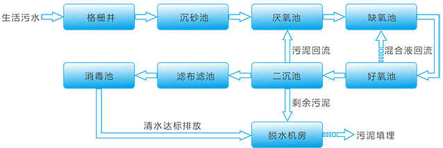 “格柵+沉砂池+改良型A2/O+二沉池+濾布濾池+紫外線消毒”工藝:進水中漂浮物及粗大顆粒物被格柵攔截,然后進入沉砂池,去除其中砂粒,防止其在后續構筑物中沉積,出水進入整個污水處理部分的核心部分改良型A2/O系統,污水從厭氧池進入生化處理系統,依次流經厭氧池、缺氧池、好氧池,同時混合液回流至缺氧池,出水排至二沉池,泥水分離,污泥回流至生化系統,污水進入濾布濾池,過濾后出水進入紫外線消毒池,達標后排放。